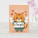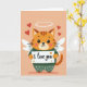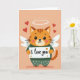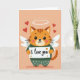 This card shows a ginger cat facing forward on a soft peach background, with white wings and a small glowing halo above its head. The cat has big black eyes, pink cheeks, and a gentle little smile that feels sweet and caring ❤️. It’s wearing a dark green sweater with matching pants that have small dots, giving it a cozy look. Between its paws, the cat holds a white sign with the words “I love you” written in smooth, flowing black lettering. Small orange hearts sit near the words, and a few bigger red hearts float around the cat for an extra romantic touch 💘. The ginger stripes on its head and tail, along with a few simple whiskers, add clear detail without feeling busy. Overall, it’s a warm, affectionate design that’s easy to read and perfect for someone you care about.