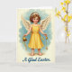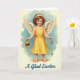 This design shows a sweet childlike figure centered on the front, with soft brown curls, rosy cheeks, and bright eyes that seem to gaze outward with a gentle, friendly warmth 🌷. Light feathered wings fan out behind the child, giving the scene an airy, springtime feel against a mottled sky-blue backdrop that looks like thin clouds. The child wears a sunlit yellow dress with a pleated skirt and a snug waist, and a simple white headband rests across the hair. Bare feet touch a creamy ground, adding a small, tender detail that keeps the angelic look feeling close and approachable, like a quiet hug from a friend. In one hand, the child holds a large golden bell tied with a braided rope, while the other hand lifts a smaller bell, as if ready to ring out a cheerful greeting 🐰. At the bottom, a flowing line of text sits centered in a darker tone that stands out clearly against the pale base. Soft shading highlights the folds of the dress, the feather textures of the wings, and the warm gleam on both bells. The larger bell hangs slightly lower, its braided cord curving in a loose loop near the child’s knee.