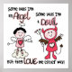 Some days an angel, some days a devil? If that sounds familiar you'll love this cute angel and devil design on Angel Devil T-shirts, mugs, bags, cards, bodysuits, stickers, keychains, pillows, and other items. Features a hand drawn stick figure angel with a pink heart dress standing on a cloud and a devil with a pitchfork!