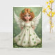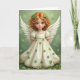 This card shows a cherubic young girl centered in a dreamy green field, with soft light drifting across the grass and clover around her 💚. Pristine white wings open behind her, and her red‑gold curls spiral down with tiny shamrock hairpins tucked in like little lucky notes ☘️. Her large emerald eyes look straight ahead with a gentle, inviting focus, and her rosy cheeks give her face a sweet, friendly warmth. She wears a flowing cream‑white gown with puffed sleeves and a square neckline edged in fine golden lace, as if dressed for a quiet springtime stroll with someone dear. Scattered green shamrocks decorate the dress, their plush-like texture echoing the floating clover in the background and adding a cozy, close-to-you feel. The greeting “Happy St. Patrick’s Day” sits near the top in deep green lettering, with a smaller line beneath in soft gold placed just above her wings. Behind her, the backdrop fades from darker emerald at the edges to a lighter, sun-dappled green near the center, with clover shapes lightly drifting across the scene.
