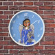 This wood wall clock has white hands and numbers with an angel in a blue dress with stars sitting on a cloud holding a white angel cat, both have silver halos on a sky blue background.