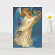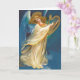 vintage painting of an angel with angelic expression, beautiful flowing dress and golden harp in blues and beige.