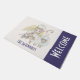 A personalized welcome doormat designed with a serene angel with yellow wings holding a shepherds crook. Sitting beside 2 white fluffy lambs.