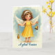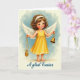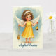 Designed with a cherubic, childlike figure centered against a softly shaded background of pale blues and creamy tones, the artwork feels gentle and affectionate. Her wide green eyes and rosy cheeks face forward with a sweet, open look, and her curly brown hair is held back by a simple white headband. She wears a sleeveless buttercup-yellow dress that falls lightly, finished with a thin white pattern near the hem, suggesting a sunny spring day 🌷. Feathered white wings spread from her back, while her bare feet rest on a faint, light ground that keeps the scene calm and grounded. In each hand she holds a small golden bell on a twisted cord, and the way her fingers curl around them suggests she’s about to ring them for someone special. Along the lower portion of the card, a short Easter greeting appears in flowing letters, set in a soft gray tone that stands out gently without overpowering the illustration 🐰. The bells catch the light with tiny highlights, and the wings show fine feather lines against the pastel sky.