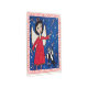 This metal wall art print has an angel in a red dress floating in a dark blue night sky with stars with a black and white angel cat catching falling candy canes in a fancy red border on a white background.