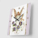vintage art painting in purples and white with lovely angel sitting on a fluffy white cloud holding a scroll.