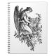 vintage drawing of an angel playing the harp surrounded by leaves. beautiful black and white illustration of angelic figure kneeling on a leafy ground and a musical instrument.