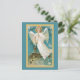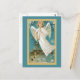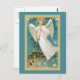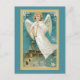 A beautiful vintage illustration of an angel in white hovering over a church while holding two long golden horns. At the bottom is a "Merry Christmas" wish. Colors are white and turquoise