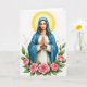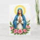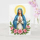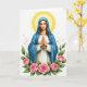 This card shows a tall, centered woman in a flowing blue cloak draped over a white tunic, standing against a bright white background. Small touches of gold appear at her neckline and waist, adding a gentle glow without overpowering the scene. Her hands are folded together with fingers lightly intertwined, and her closed eyes and soft mouth create a tender, caring look, as if she’s quietly thinking of someone close. A thin golden ring of light circles her head, warming her face and giving her cheeks a faint blush. Along the bottom edge, a cluster of full pink roses and deep green leaves forms a romantic frame, like flowers set out for a dear friend 🌷. Scattered around the background are tiny rosy specks that float like distant petals, keeping the space airy and calm 🐇. The text sits near the top in a light gold color, leaving the roses at the bottom to anchor the composition.