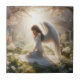 This ceramic tile artwork presents a tranquil and angelic scene. At its center is a kneeling figure with large, white wings, draped in an off-the-shoulder, flowing white gown. The figure's long hair cascades gently, adding to its serene and celestial presence. The setting is a lush, garden-like space filled with delicate white flowers and abundant greenery, creating an ethereal atmosphere.