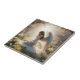 In the background, tombstones are carefully positioned, suggesting that this peaceful garden might be part of a cemetery. Soft beams of light filter through the trees, casting a heavenly glow on the kneeling figure, enhancing the solemn yet comforting essence of the scene. While the tile mimics the traditional stained glass style, it carries its own distinct charm, with subtle shading and textural elements that bring depth to the composition.