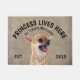 Angry Chihuahua Personalized Dog lover welcome doormat. This welcome mat can be personalized with your dog’s name, the slogan can also be changed or you could use a picture of your own dog (make sure it's transparent). Text reads: Princess lives here…. All treats welcome