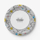 Black linear angles and circles in primary colors of red, yellow and blue make up the contemporary retro pattern reminiscent of Mid Century Modern design and the Atomic Age of the 1950's and 1960's that decorates this paper plate along with custom template name and monogram text.