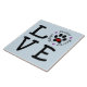 This ceramic photo tile shows your love for animals and animal rescue. The word "love" is spelled with the letter O represented by a paw print with a red heart inside surrounded by the words adopt, foster and rescue separated with purple paw prints. This is a great gift for yourself or any animal lover. This could also be used by animal shelters as a raffle item, in a silent auction fundraiser or 5K run prize.