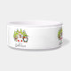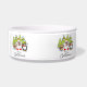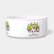 A cute, colorful Christmas holiday design pet bowl featuring a polar bear, penguin, and mouse all with scarves and ice skates with snow covered trees and text that reads It's Christmas!