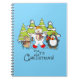 A cute, colorful Christmas holiday design notebook featuring a polar bear, penguin, and mouse all with scarves and ice skates with snow covered trees and text that reads It's Christmas!