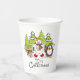 A cute, colorful Christmas holiday design paper cups featuring a polar bear, penguin, and mouse all with scarves and ice skates with snow covered trees and text that reads It's Christmas!