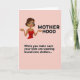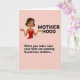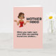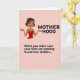 This greeting card features a digital illustration of a woman in a modern animated look, set against a soft, single-tone pink background. She has dark brown hair in a short bob, bright green eyes, and a wide smile with a touch of red lipstick that reads like a friendly, knowing grin ❤️. Her arms stretch outward with palms up, as if sharing an “I’ve been there” moment with another parent, and she wears a red camisole that stands out warmly against the pale backdrop. Long, dangling yellow earrings add a sunny accent 🌼 and draw attention toward her face. At the top, the word “MOTHERHOOD” appears in large, uppercase black letters centered above her head. Near the bottom, a smaller line of black text reads, “When you make sure your kids are wearing brand new clothes…”, placed below her outstretched hands. The background stays uniformly pink with flat color areas and crisp outlines around the figure and lettering.
