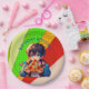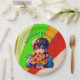 Personalized birthday boy paper plates for a boy's pizza birthday party. Cute anime boy holding a piece of pizza with a colorful pop art background.