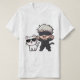 chibi-style anime illustration features a spiky white-haired character wearing a sleek black blindfold and a dark outfit, striking a fun double peace sign pose. Beside them, a cute white cat with black sunglasses and blushing cheeks adds an extra layer of charm to the design. The minimalist white background enhances the playful and kawaii (cute) aesthetic, making it perfect for anime and cat lovers alike. Ideal for wallpapers, social media posts, or merchandise featuring fun and trendy anime-inspired artwork.