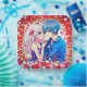 Anime boy and girl cuddling surrounded by colorful flowers. Cute anime couple, girl with pink hair and boy with blue hair. Colors are red, blue, white, pink and purple. Pretty for weddings, Valentine's Day or an anniversary.