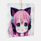 Cool anime girl wearing cat ears headband and headphones with pink hair and pink and blue snowflakes. Add a personal message on the back on the Christmas ornament in the personalize area.