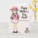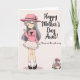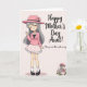 This greeting card features a soft pink background with a gentle striped texture that sets a sweet, affectionate tone ❤️. On the left, a tall anime-style woman stands with closed eyes and a wide, content smile, her long gray hair flowing down past her shoulders. She wears a wide-brimmed pink hat trimmed with small flowers, a long-sleeved pink top with a white collar and a small black bow, and a white polka-dot skirt with a ruffled edge that feels dressy yet cozy. White socks with a red zigzag detail lead into dark strap shoes, and her raised right hand looks like a friendly wave meant for someone she cares about. On the right side, dark lettering reads “Happy Mother’s Day Aunt!” with a second line below that says “I love you more than words can say,” both set clearly against the pale background. The lighting stays soft and even, keeping the pinks, whites, and grays calm and romantic, like a quiet moment shared between family 🌼. In the bottom right corner, a smaller matching figure appears nestled among light pink blossoms, echoing the same peaceful smile and gentle pose. The flowers cluster around her in rounded petals, framing the tiny character against the pale pink field.