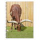 Ankole-Watusi (Bos taurus) grazing in front of a panel made of wooden slats