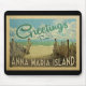 This Greetings From Anna Maria Island vintage postcard design features a sandy beach with a beautiful turquoise ocean water and above the sea, a blue sky with billowy white clouds. In vintage travels style.