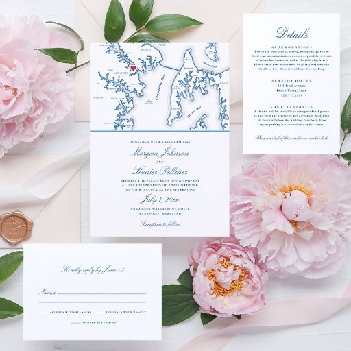 Looking for the perfect navy and gold wedding invites for your wedding in Annapolis? Check out these elegant and easy to order invitations featuring a navy map of Annapolis and Kent Island and real gold foil printed names with a little tiny foil heart over Annapolis. These elegant Annapolis map wedding invitations are perfect for any of the amazing wedding venues in the area including : Annapolis Waterfront Hotel, Kent Island Resort, Paca House & Garden, The Westin Annapolis, Historic Inns of Annapolis, Graduate Annapolis, Annapolis Maritime Museum, Whitehall Annapolis, Doubletree Annapolis, Port Annapolis Marina, Quiet Waters Park, Chesapeake Bay Foundation, Watermark Charter Cruises, the US Naval Academy Chapel, Chart House Annapolis or Silver Swan Bayside.