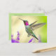 Postcard featuring a close up of an anna's hummingbird with iridescent green and magenta pink feathers, flying over hazy purple salvia flowers. Beautiful and unique card for hummingbird, garden and nature lovers. Photo taken in Pasadena, California.