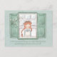 This Anne of Green Gables postcard features our beloved Anne peeking out of a window with green shutters. The words “It's been my experience that you can nearly always enjoy things if you make up your mind firmly that you will.” are written in green. The background is pale blue. Colors include, sage green, pale blue, orange, pink and white.