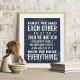 Our unique frameable print is easy to customize with your anniversary and your children's names and birthdates! Modern vintage typography design features the words "First we had each other, then we had you, now we have everything" with spaces for your wedding anniversary and three children's birthdays, on a navy blue background. Have two kids? Check our shop for an alternate version.