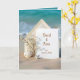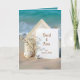 A blank card is elegantly set against a beach backdrop, accompanied by delicate white gypsophila flowers, a starfish, and a sand dollar.