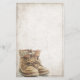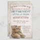 Announcement of retirement with old worn and weathered lace-up boots in vintage style. Gender-related text, the year, the honorary text, the date, the time, the place of celebration and RSVP can be customized.