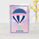 Announcing the birth of a new baby boy card, with a blue and pink hot air balloon, and an illustration of a baby boy in the balloon basket, on a pretty lavender sky.