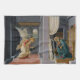 The Annunciation (1485) by Sandro Botticelli is a vintage Renaissance Era fine art religious portrait painting. A row of pillars divides the one point perspective scene with the Angel Gabriel on the left from the kneeling Virgin while she receives his divine message in her bed chamber.