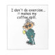 Mildred is a gray haired elderly lady with some pretty strong opinions! On this funny exercise theme design she states "I don't do exercise...it makes my coffee spill."! Humorous exercise theme T-shirts, mugs,bags, cards, stickers, magnets, keychains, ornaments, and more, sure to make yourself and others chuckle!