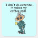 Mildred is a gray haired elderly lady with some pretty strong opinions! On this funny exercise theme design she states "I don't do exercise...it makes my coffee spill."! Humorous exercise theme T-shirts, mugs,bags, cards, stickers, magnets, keychains, ornaments, and more, sure to make yourself and others chuckle!