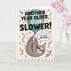 Cute sloth wearing a party hat, holding a balloon, with the funny message "Another Year Older... SLOWER!" and a playful "Is it my birthday?"