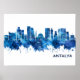 Blue Watercolor Skyline of Antalya, a Turkish resort city with a yacht-filled Old Harbor and beaches flanked by large hotels