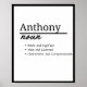 This personalized name definition poster is more than just a decoration; it's a thoughtful and meaningful addition that will be cherished for years to come. Celebrate the individuality of Anthony with this beautifully designed and personalized poster.