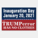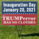 The Trump Error has no clothes. When you vote Biden on election day 2024, you're telling the world that you see that the Trump Error has no policy clothes, just like the person in that story you read when you were younger. Trump lies, he misinforms, he misstates, he skates around issues, and when exposed to the cold hard facts of reality, he is exposed as a con. Design description: The top half is a blue background with a template for the inauguration day date over two lines. Below that is a lighter blue stripe, covered with 15 small white stars, each in white sans serif font. Below that on a red background are the words "The Trump error has no clothes" in a white serif font similar to the one Trump uses for his campaign material.