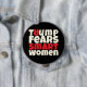 The feminist button, "Trump Fears Smart Women," highlights a perceived anxiety on the part of Donald Trump when dealing with intelligent, accomplished women. The message suggests that Trump is intimidated or threatened by the presence and capabilities of women who are intellectually strong. This simple phrase encapsulates the idea that Trump's actions and words indicate a fear of women possessing high intelligence and competence.