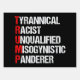 Anti Trump Funny Acronym Yard Sign in black. It features a word poem describing his character: tyrannical, racist, unqualified, misogynistic panderer. Resist this president and continue to support the resistance efforts for equal rights and basic human decency in America. Fight for freedom in our country for all races and genders.