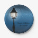 Romantic paper plate design for wedding featuring an old time lamp post glowing against a blue night sky with stars. Next to the 18th century street light there are two customizable text areas for the date of the wedding and for the names of the couple who is getting married.