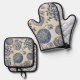 Antique Blue Toile Botanical Flower Print Floral Oven Mitt & Pot Holder Set