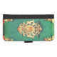 An antique look design with copper trim and green frayed fabric giving it an aged look. The center is embellished with a decorative copper frame surrounding an opal gem. A unique and elegant design.