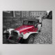 Antique Car in black and white with red color highlighted.