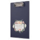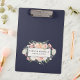 Elegant floral clipboard features your name and/or business name framed by a border of lush watercolor flowers in blush pink, sage green, peach and cream, on a contrasting deep midnight navy blue background. Design repeats on reverse side. Matching business cards and accessories are available below or in our shop.